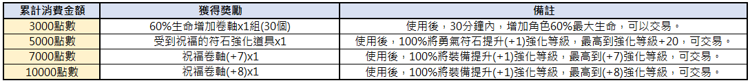 活動期間內,於遊戲商城中「累積消費」達指定金額,即可於活動結束後獲得對應獎勵。(僅一次)