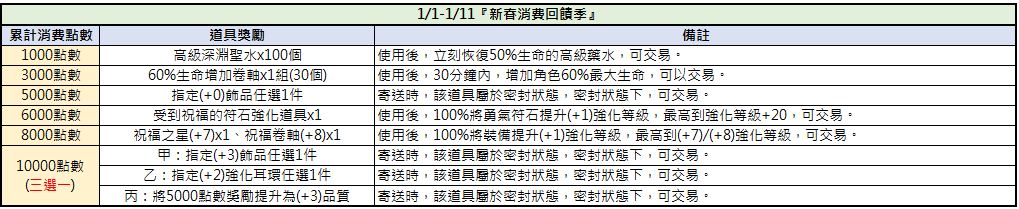 2.活動獎勵將統一於1/20(二)23:59前發送至帳號內第一個角色信件(L)中,若無收到獎勵者請先領取舊信件或至「客服中心」反應。