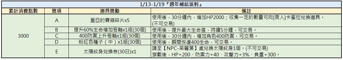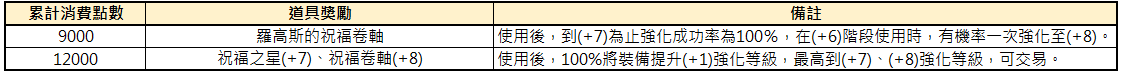 活動期間內,於遊戲商城中「每日消費」達1000點數,即可累計獲得以下道具。(不可重複領取)